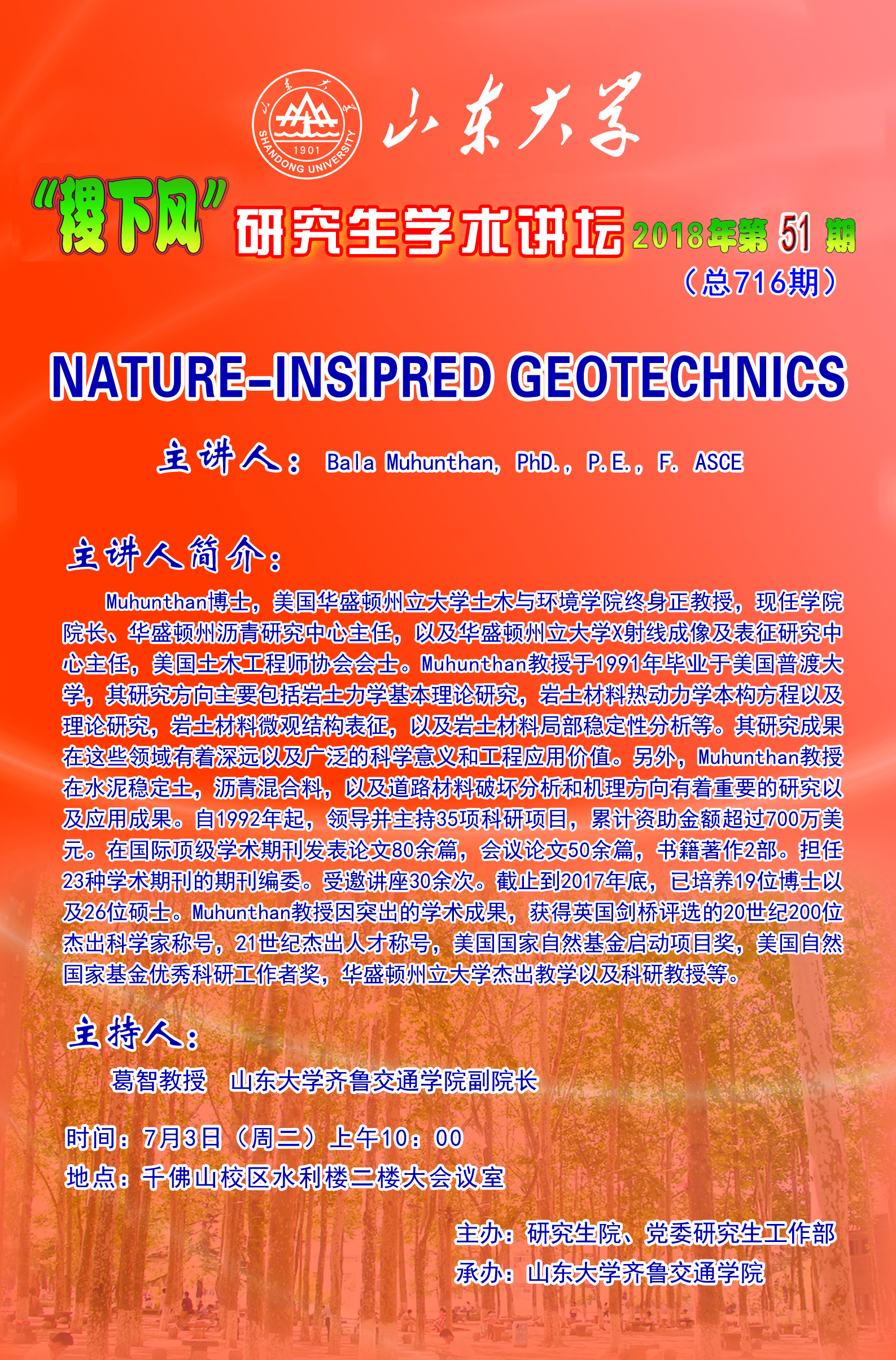 Muhunthan博士,美国华盛顿州立大学士木与环境学院终身正教授,现任学院院长、华盛顿州沥青研究中心主任,以及华盛顿州立大学X射线成像及表征研究中心主任,美国土木工程师协会会士。Muhunthan教授于1991年毕业于美国普渡大学,其研究方向主要包括岩土力学基本理论研究,岩土材料热动力学本构方程以及理论研究。岩土材料微观结构表征,以及岩土材料局部稳定性分析等。其研究成果在这些领域有着深远以及广泛的科学意义和工程应用价值。另外,Muhunthan教授在水泥稳定土,沥青混合料,以及道路材料破坏分析和机理方向有着重要的研究以及应用成果。自1992年起,领导并主持35项科研项目,累计资助金额超过700万美元。在国际顶级学术期刊发表论文80余篇,会议论文50余篇,书籍著作2部。担任23种学术期刊的期刊编委。受邀讲座30余次。截止到2017年底,已培养19位博士以及26位硕士。Muhunthan教授因突出的学术成果,获得英国剑桥评选的20世纪200位杰出科学家称号,21世纪杰出人才称号,美国国家自然基金启动项目奖,美国自然国家基金优秀科研工作者奖,华盛顿州立大学杰出教学以及科研教授等。