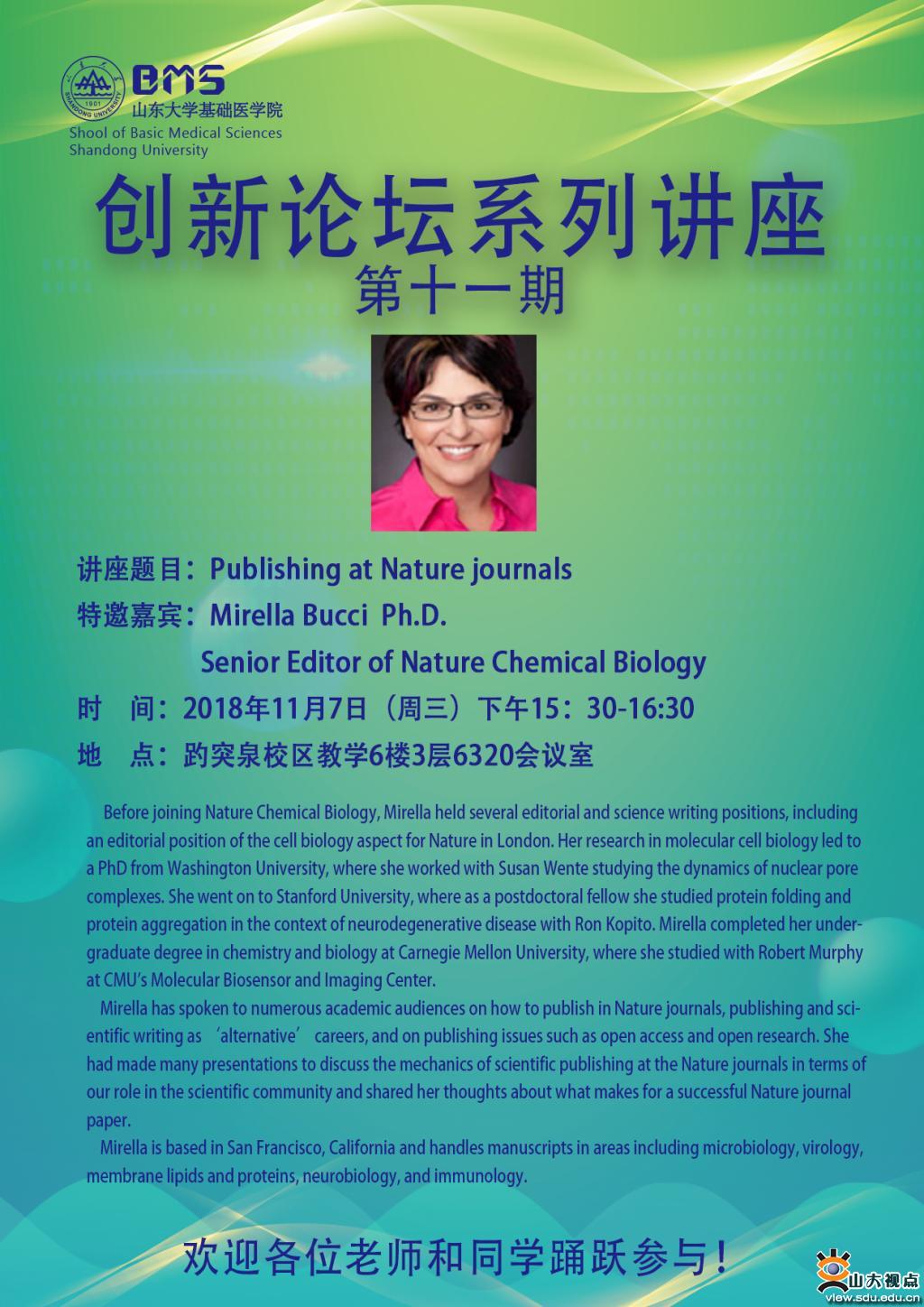 Mirella has spoken to numerous academic audiences on how to publish in Nature journals, publishing and scientific writing as ‘alternative’ careers, and on publishing issues such as open access and open research. She had made many presentationsto discuss the mechanics of scientific publishing at the Nature journals in terms of our role in the scientific community and shared her thoughts about what makes for a successful Nature journal paper.