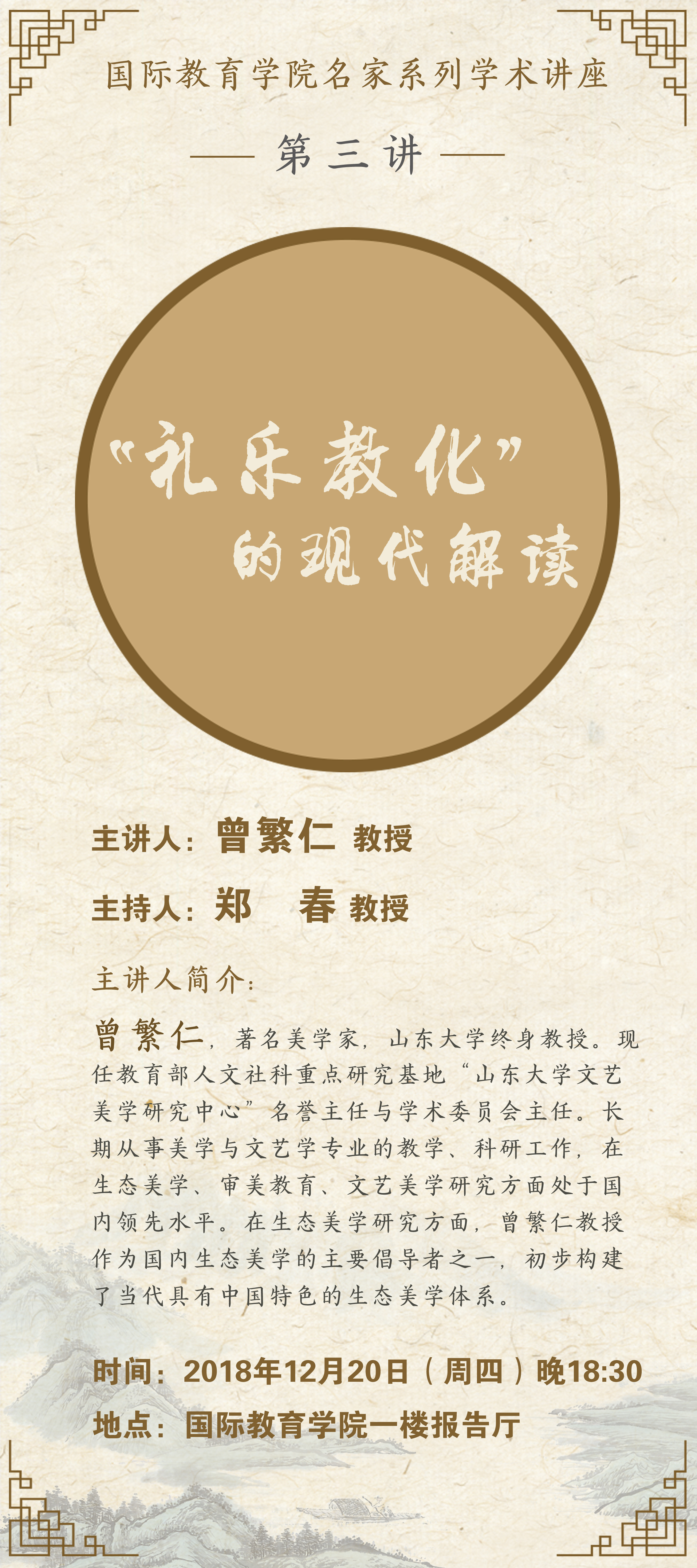 曾繁仁,著名美学家,山东大学终身教授。现任教育部人文社科重点研究基地“山东大学文艺美学研究中心”名誉主任与学术委员会主任。长期从事美学与文艺学专业的教学、科研工作,在生态美学、审美教育、文艺美学研究方面处于国内领先水平。在生态美学研究方面,曾繁仁教授作为国内生态美学的主要倡导者之一,初步构建了当代具有中国特色的生态美学体系。
