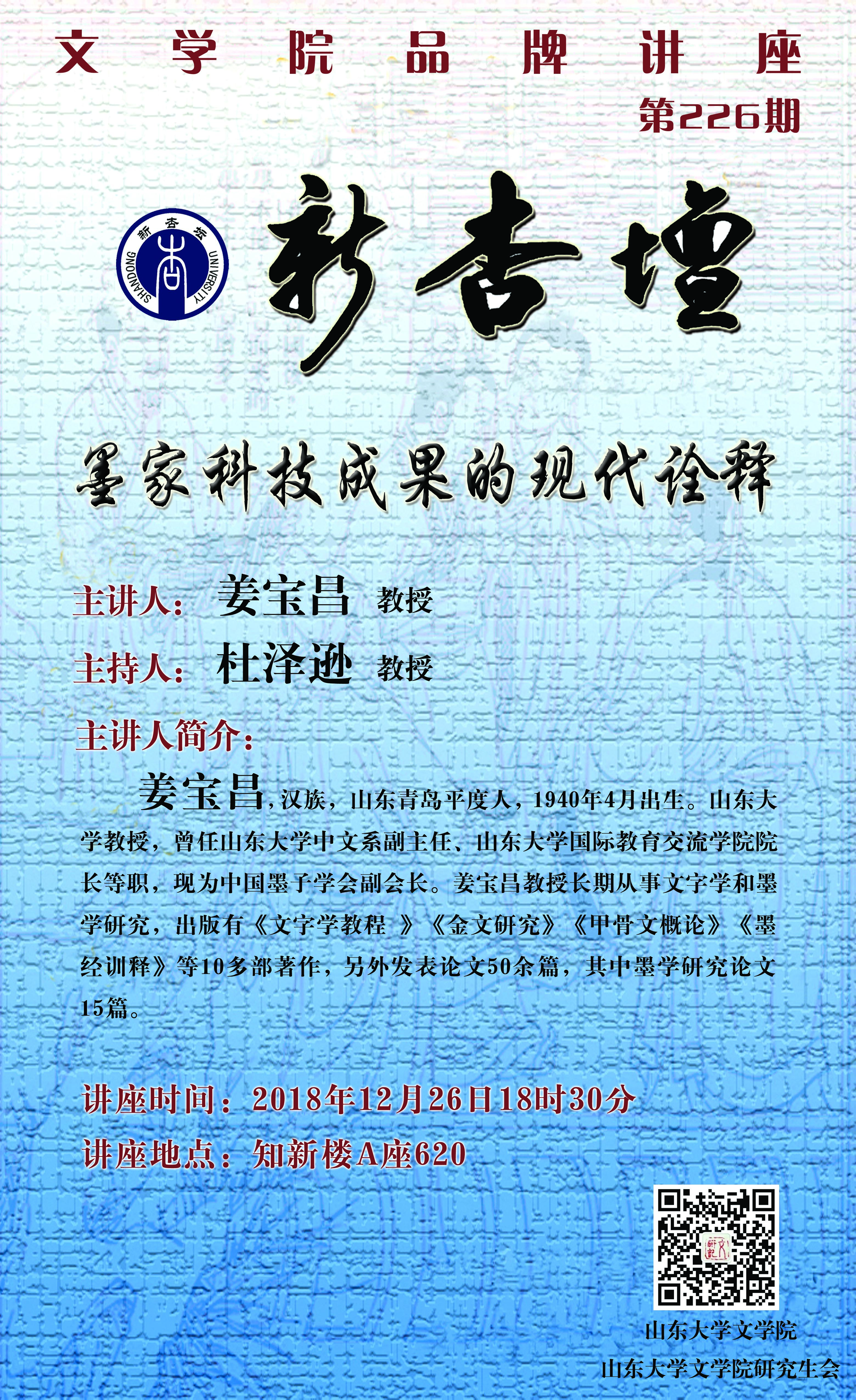 姜宝昌,汉族,山东青岛平度人,1940年4月出生。山东大学教授,曾任山东大学中文系副主任、山东大学国际教育交流学院院长等职,现为中国墨子学会副会长。姜宝昌教授长期从事文字学和墨学研究,出版有《文字学教程》、《金文研究》、《甲骨文概论》、《墨经训释》等10多部著作,另外发表论文50余篇,其中墨学研究论文15篇。