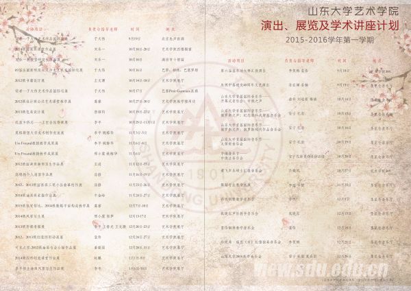 [本站讯]近日,艺术学院2015-2016学年第一学期音乐演出、美术展览以及学术讲座计划确定,正式公布。