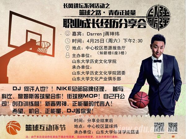 山东大学历史文化学院长风系列论坛活动之“篮球之路”&HoopLife讲座,讲你不知道的NBA,说你不了解的Nike故事,跟你分享不懈努力的精彩人生。他是青春、梦想和正能量的代言,是男神,也是榜样。他的成长之路,值得当代大学生思考和学习。