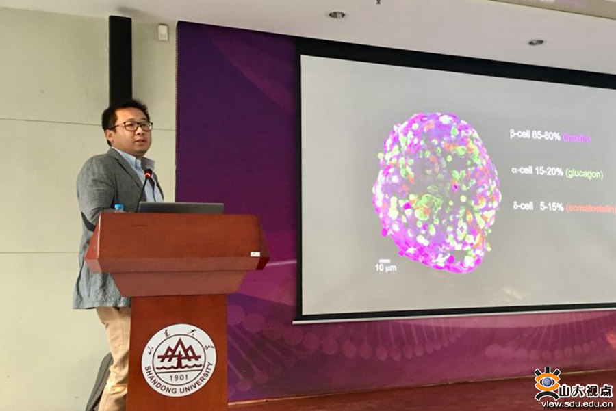 张全博士介绍了目前对于胰岛d细胞的研究进展。他指出,分泌生长抑素的d细胞与分泌胰岛素的b细胞对高糖刺激的响应具有一定的相似性,但是d细胞呈现出更强的敏感性。利用药理学方法和动物实验,张全博士发现,高糖刺激引起的d细胞分泌主要由KATP非依赖性的机制介导,与b细胞的分泌机制有明显差异。张全博士进一步采取电生理技术和钙成像的方法,发现高糖刺激d细胞分泌生长抑素的新机制,这些研究对于理解胰岛细胞稳态和机体血糖调控具有重要意义。报告结束后,张全博士解答了在场师生提出的问题,并与相关领域教授进行了进一步交流讨论。基础医学院生理与病理生理学系、生物化学与分子生物学系、细胞与神经生物学系、药理学系和医学免疫学等学系的近百名师生聆听了报告。