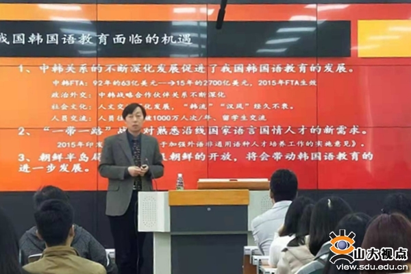 [本站讯]10月25日,山东大学东北亚学院牛林杰教授做客外国语学院,并为外院师生带来了主题为“非通用语专业大学生的知识结构建构”的学术讲座。本次讲座由朝鲜语专业朴银淑教授主持,外国语学院部分师生聆听了此次讲座。