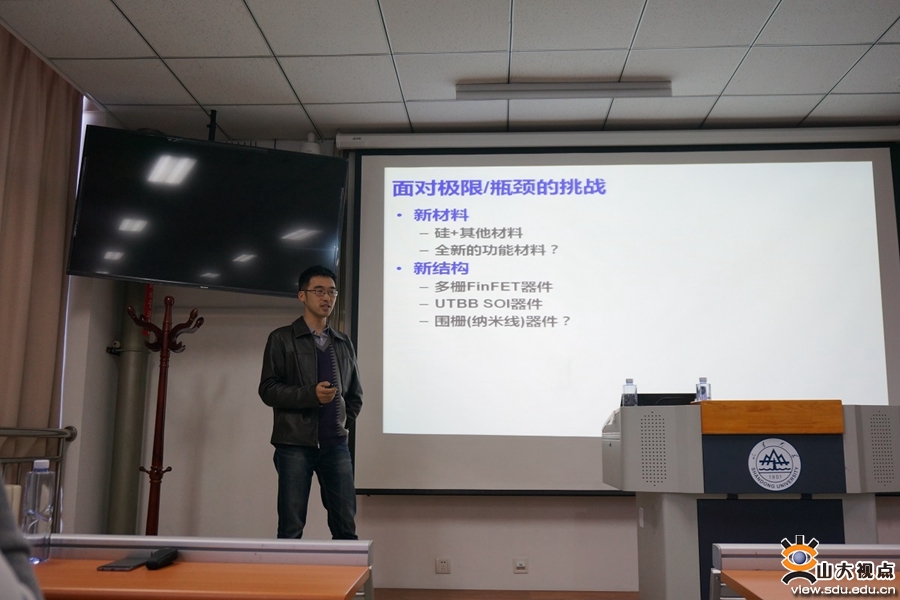 报告中,王润声副教授对微电子学的发展前沿作了一个综合性的介绍。首先从半导体集成电路产业发展入手,回顾并展望了产业的应用驱动力;随后在面向应用的前提下,介绍了CMOS技术发展的瓶颈和挑战、应对的技术变革和发展趋势,介绍了摩尔定律及其新的实现方式,并指出微电子技术发展的主线是高密度集成;最后对微电子学及相关产业的未来发展进行了展望。报告结束后,王润声副教授就大家提出的问题进行了详细解答。信息学院多名博士、硕士、本科生参加本次讲座。