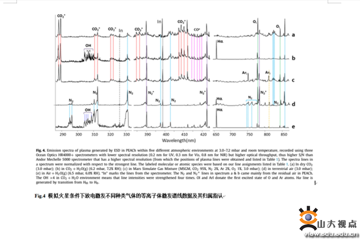 武中臣教授搭建了火星条件下的辉光放电装置,并利用华盛顿大学的火星舱(PEACh)完成了以下三项实验观测:(1)就位监测辉光放电过程在模拟火星大气中产生的自由基的种类:CO2+, CO+, OI, O3, HIII, HII, OH, ArI, N2, N2+ 等;(2)就位监测并定量分析了以NaCl为起始剂的放电产物中的NaClO3、NaClO4和 Na2CO3成分; (3)进行了两套氧化实验,定量比较并发现:在所采用的实验条件下,静电辉光放电的电子氧化能力比紫外光(UVC)光子高3个数量级;换算到火星条件下,静电辉光放电电子的氧化能力将比紫外光(UVC)光子的氧化能力高7个数量级。因此,火星表面沙尘过程所导致的静电辉光放电有可能是产生火星高浓度高氯酸盐的重要机理。