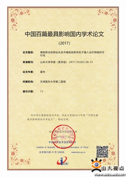 [本站讯]11月1日,中国科技论文统计结果发布会召开,《山东大学学报(医学版)》2017年第2期刊发的由天津医科大学第二医院肿瘤科霍彬等撰写的文章“模板联合肋骨钻孔技术辅助放射性粒子植入治疗肺癌的可行性”入选2017年度“中国百篇最具影响国内学术论文”。