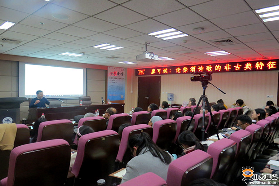 [本站讯]近日,北京大学中文系教授、博士生导师、长江学者特聘教授廖可斌做客新杏坛,在山东大学中心校区作题为“论徐渭诗歌的非古典性特征”的学术报告。报告会由文学院古代文学研究所所长孙之梅教授主持,文学院古代文学学科的部分教师出席本次讲座。