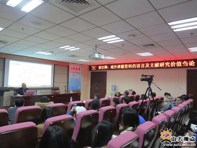 讲座中,雷汉卿教授先简要介绍了与此次讲座有关的域外禅籍资料,即在东亚(日本、韩国)流传的有关禅宗的文献资料,包括禅宗灯录、语录、抄物、辞书和现代译著,并详细论述了域外禅籍资料在语言研究与文献研究中的价值和意义。他谈到,从语言研究方面看,浍域外禅籍中出现的部分俗字有助于我们探索汉字的简化历程。他强调,汉字的演化是在俗文字的基础上进行的,域外禅籍资料,尤其是抄本资料中保存了大量的俗文字,借助这些俗文字可以探索和还原汉字简化的中间过程。为了让在场观众获得更直观的感受,他以“岁”字为例,演示了如何利用域外禅籍资料对汉字的简化过程进行考证。雷汉卿还谈到,域外禅籍资料对俗语词研究也有帮助。抄物常用“世话”、“唐谚”、“谚”、“方言”、“俗语”等标识俗语,对于俗语的解说极有参考和利用价值。从文献研究方面看,域外禅籍资料可以用来考证文献版本问题,也可以用以进行文字校勘。比如从日本所见的《五灯会元》抄本中可以看出当时《五灯会元》的分卷与今不同,文字也有出入,如果利用这些资料对《五灯会元》进行新的校勘,将会对禅宗哲学研究、历史研究、思想研究产生很大的意义和帮助。讲座最后,张树铮教授对雷汉卿教授的发言作了总结,再次强调海外汉籍是汉语研究的重要资料,并鼓励同学们从问题入手,在研究中扩大自己的知识面。