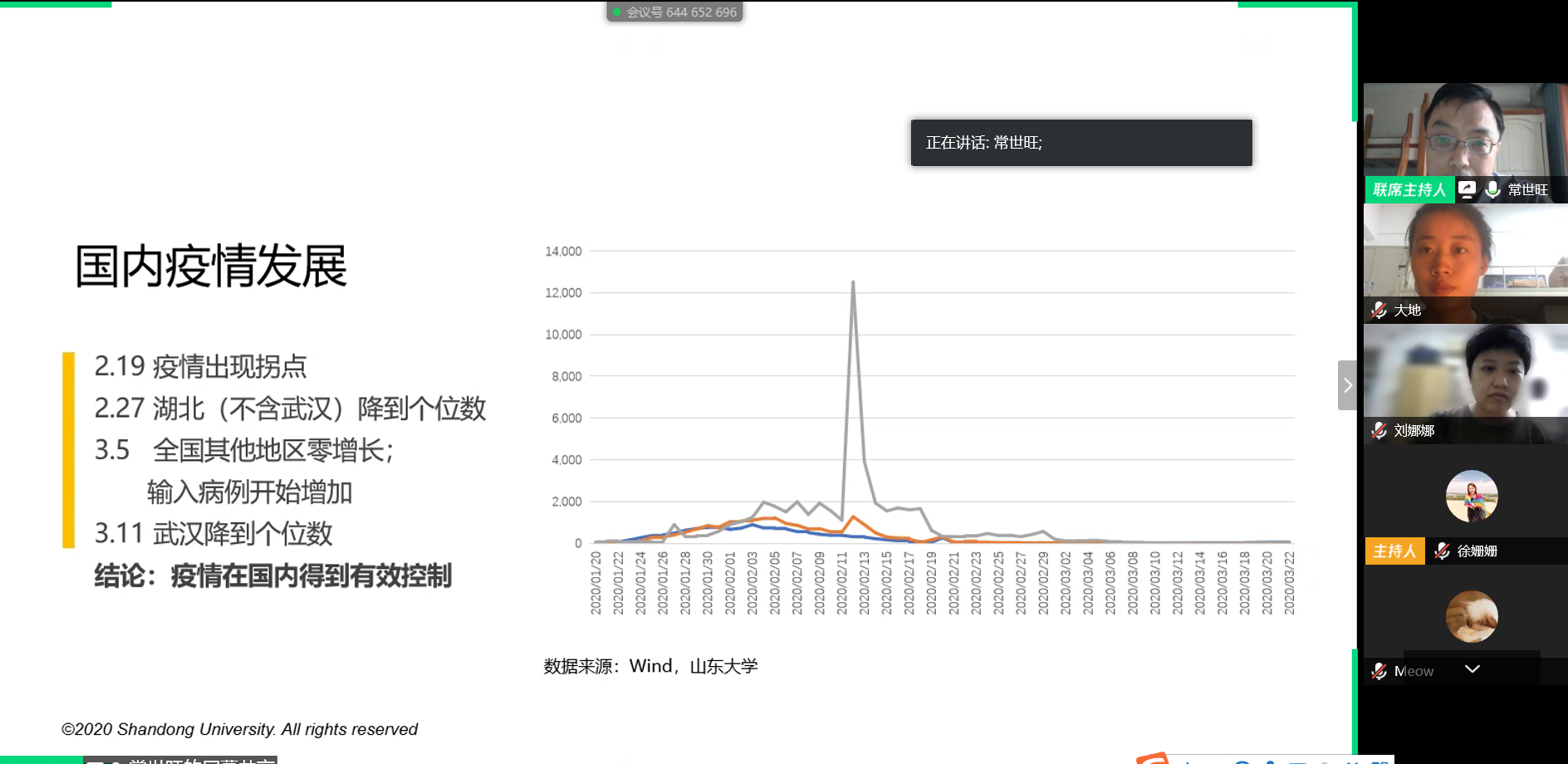 接下来,常世旺副教授从中国应对疫情的政策出发,从助力疫情防控、减轻社保负担、保护小微企业和稳外资稳外贸四个方面精心梳理并介绍了中国应对疫情的财税政策与主要货币政策。他表示,经过两个月的努力,中国当前已进入了“防疫情-稳增长-关注国际形势”的阶段。常世旺副教授在报告中着重探究了中国抗疫举措与财税政策,总结得出,此次疫情是短期冲击,不会改变中国经济发展的中长期趋势,但中国应及时警惕因需求不足导致的经济危机,将财税政策的重点由收入端转向支出端;同时中国也需关注世界疫情发展状况,若国外疫情渐次持续到6月,世界经济将出现衰退,中国也将承受巨大的外部压力,因此中国应提前做好充分应对的准备。