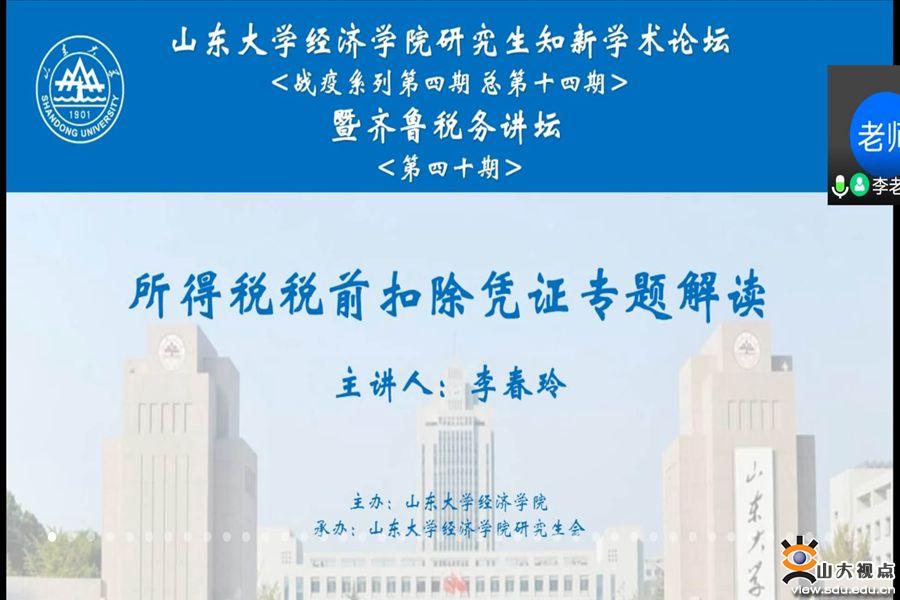 [本站讯]4月6日下午,经济学院第十四期研究生知新学术论坛(战疫系列第四期)暨齐鲁税务讲坛(第四十期)以线上会议形式举行。山东省税务系统业务能手李春玲为学院师生带来了题为“所得税税前扣除凭证专题讲读”的报告。论坛由经济学院副院长石绍宾主持。