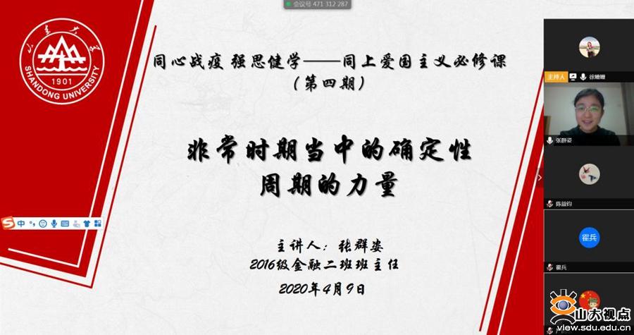 [本站讯]4月9日,经济学院“同心战疫,强思健学”——同上“爱国主义必修课”班主任主题讲座第四期在线上举行。2016级金融二班班主任、经济学院张群姿教授作为主讲嘉宾,作了题为“非常时期当中的确定性:周期的力量”的报告。