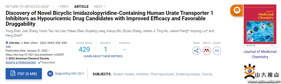本研究以“Discovery of Novel Bicyclic Imidazolopyridine-Containing Human Urate Transporter 1 Inhibitors as Hypouricemic Drug Candidates with Improved Efficacy and Favorable Druggability”为题发表在药物化学领域国际期刊Journal of Medicinal Chemistry上。药学院博士研究生赵彤和硕士生章健为本论文的共同第一作者,展鹏教授、刘新泳教授、南方医科大学庞建新教授为本论文的共同通讯作者。山东大学为第一通讯单位。
