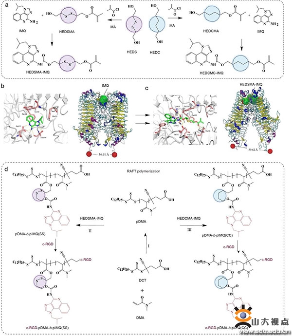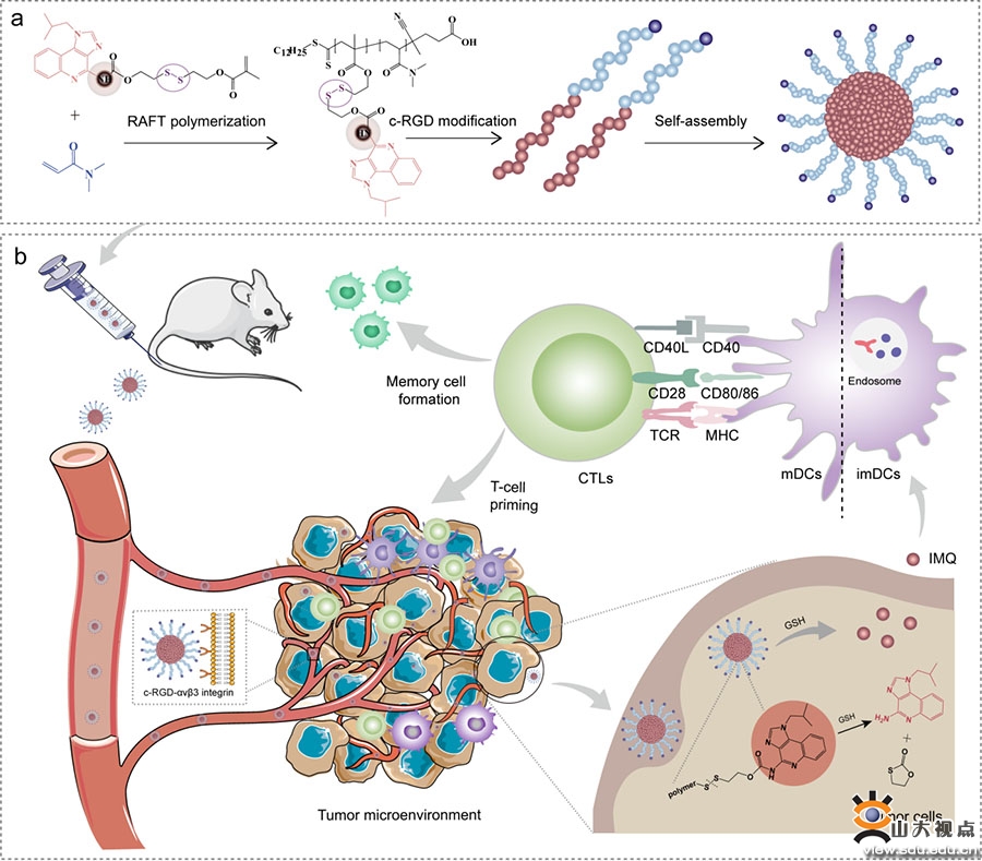 近日,山东大学药学院张志岳教授团队利用晶体结构分析,表明IMQ的C4位氨基是其发挥作用的关键活性位点,设计开发了一种巧妙的IMQ活性位点掩蔽策略(OFF),以期避免IMQ静脉注射后引发的免疫激活。该团队利用GSH敏感的Linker掩蔽IMQ的C4位氨基构建了一种IMQ掩蔽性单体分子HEDSMA-IMQ,并利用RAFT聚合法构建聚合物前药递送系统。在肿瘤环境中,IMQ的C4位氨基在肿瘤中能够通过1,6-消除反应得以暴露进而发挥其肿瘤特异性的免疫系统激活(ON)。原位乳腺癌小鼠经纳米免疫调节剂治疗后,观察到了肿瘤免疫微环境中细胞毒性T淋巴细胞的有效浸润,显著调动了肿瘤特定部位免疫系统的激活,同时在小鼠体内形成了免疫记忆以阻止肿瘤复发。该策略为安全递送免疫调节小分子提供了一种新思路。