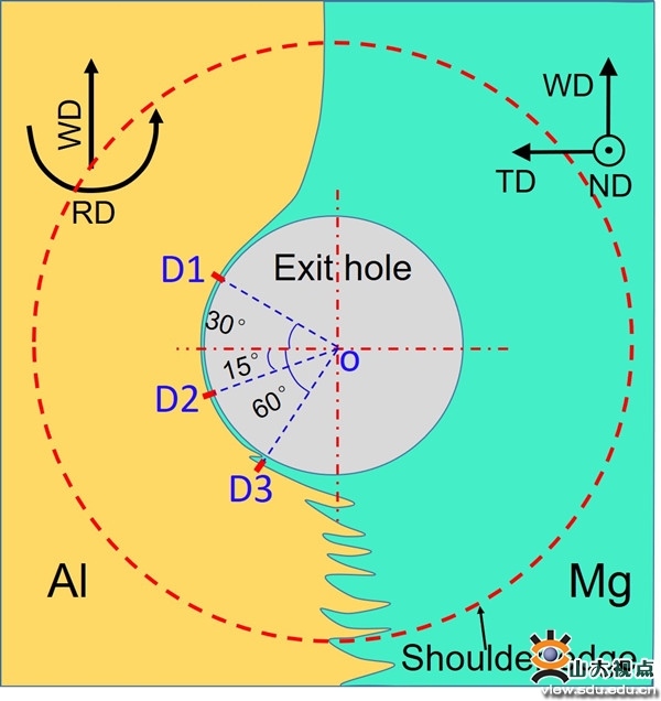铝合金与镁合金在轻量化运载器具制造中的混合应用,既能充分利用这两种轻质材料各自的优点,又能满足经济社会发展对节能减排越来越严格的要求。由于铝合金和镁合金的晶体结构和物理化学性能存在很大的差异,实现铝/镁异质合金高质量焊接是一个挑战。武传松教授课题组研发了超声振动强化搅拌摩擦焊接新工艺(UVeFSW),实现了铝合金和镁合金的高质量固相连接。利用“急停”+液氮冷却技术获得了匙孔周围的试样;对结合界面材料在围绕搅拌针塑性流动过程中Al/Mg结合界面的微观结构和金属间化合物(IMCs)的演变过程进行了深入的表征和分析,探讨了超声振动在整个过程中的作用机理。
