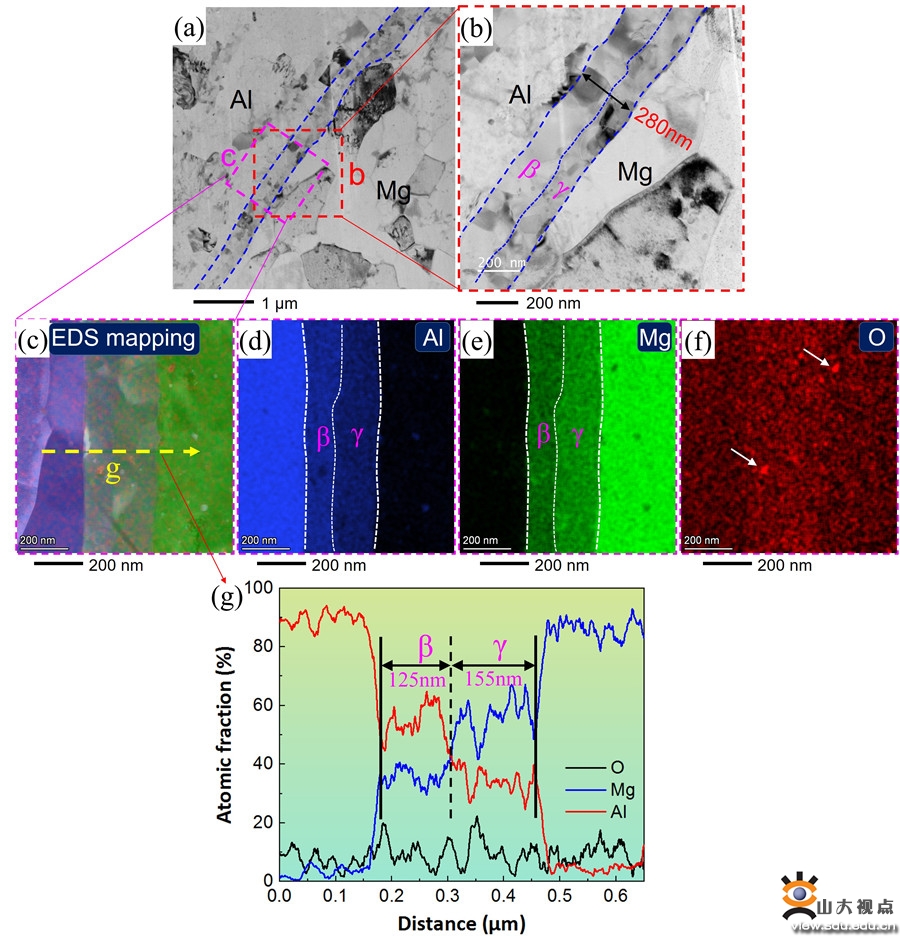 研究结果表明,铝/镁异质合金搅拌摩擦焊接过程中,Al/Mg材料发生机械锁合,并在界面或其附近形成细小的条带。这些条带与周围的基体反应形成IMCs并实现冶金结合。在界面材料在后退侧围绕搅拌针塑性流动过程中,Al/Mg界面为复杂的多层结构(IMC+Mg+IMC+Al)。当材料在搅拌头后方沉积之后,界面变为具有两个亚层(β+γ)的IMCs层,其厚度约为(220+170)nm。施加超声振动时,上述多层界面结构仅出现在材料围绕搅拌针流动的中间阶段;当材料在搅拌针后侧开始沉积时,两个亚层(β+γ)的IMCs厚度约为(125+155)nm。这表明在材料开始沉积的位置,超声振动对IMCs生成和长大发挥了抑制作用。结合超声振动对焊核区晶粒组织演变、铝合金基体中沉淀相的演变和位错密度的影响,揭示了超声振动抑制IMCs长大的机理。研究结果为优化铝/镁异质合金UVeFSW工艺参数和实现接头组织与性能的调控提供了理论依据与技术支撑。