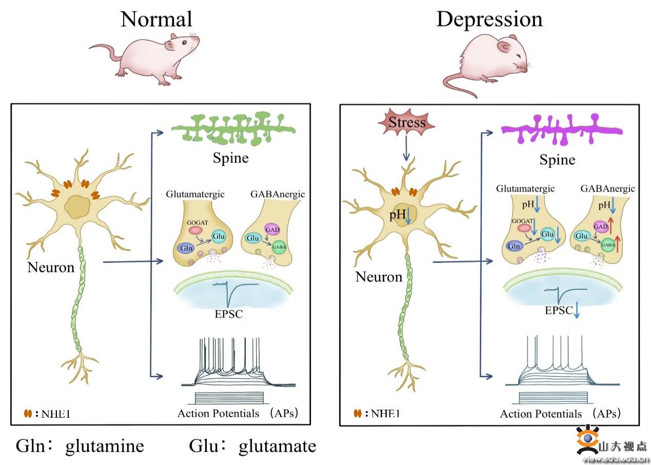随着社会的发展和各种高压事件的频发,全球抑郁症患者已超过2.64亿;其中我国抑郁症患者的终生患病率已高达6.9%,但传统的理论尚不能完全解释抑郁症的发病机制。慢性、持续的压力应激往往导致脑部出现适应性异常,神经元活动发生结构和功能的可塑性失调,从而影响正常的神经放电、神经内分泌等活动,最终促进焦虑、抑郁等情绪障碍的发生。胞内酸碱平衡是细胞维持功能活动稳态的重要特征之一,但目前为止,神经元细胞内酸碱稳态失衡在抑郁症发病中的作用机制还不清楚。Na+/H+交换体(Na+/H+ Exchanger, NHE),属于高度进化保守的转运蛋白家族,可将细胞内H+与胞外Na+按照1∶1的比例进行电中性交换,调控细胞内pH的动态平衡。NHE1是中枢神经系统中表达最丰富的亚型,尤其在皮质、海马和小脑中的表达水平较高,是哺乳动物神经元细胞内pH值稳态的主要决定因素,但其在突触可塑性调节中的作用及其异常表达是否参与抑郁症发病尚不清楚。