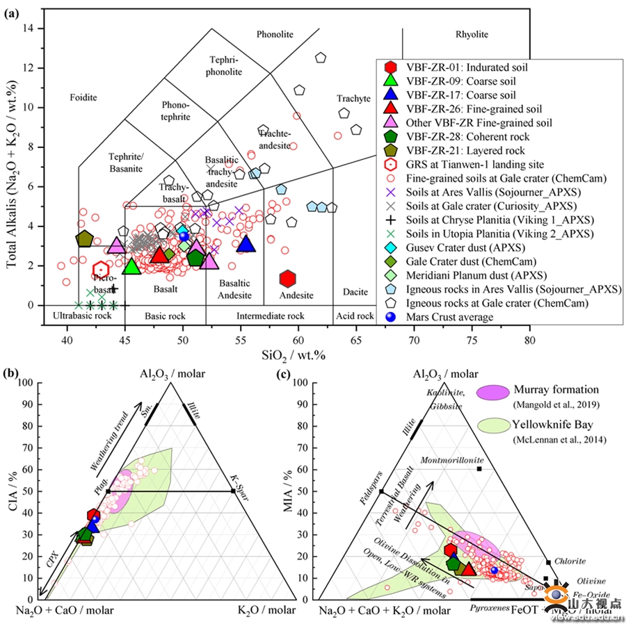 [本站讯]近日,山东大学“太阳爆发及其对行星空间环境的影响”攀登团队行星科学课题组利用我国天问一号火星探测任务祝融号火星车就位探测数据,获得了着陆区土壤和岩石的化学成分和矿物组成信息。基于化学风化指数和无定形矿物特征,首次发现天问一号火星着陆区存在弱水岩相互作用的直接证据,揭示火星北半球很可能存在冰冻海洋作用的遗迹。该研究成果于11月16日发表于Nature旗下期刊Communications Earth & Environment,第一作者为山东大学博士后刘长卿,通讯作者为行星科学课题组组长凌宗成教授。