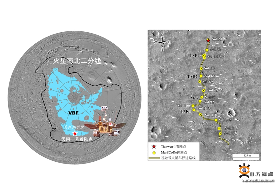 图1 火星北方荒原建造(VBF)、天问一号着陆区及祝融号火星车行进路线