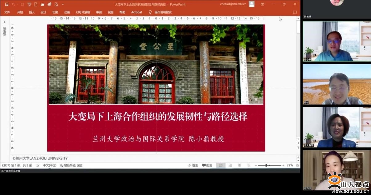 [本站讯]11月25日晚,由山东大学政治学与公共管理学院、山东大学上海合作组织研究院联合主办,亚太所亚太国家社会与人文研究中心承办的“社科与人文”系列讲座第十三讲在线上举行,讲座题目为“大变局下上海合作组织的发展韧性与路径选择”,兰州大学政治与国际关系学院副院长陈小鼎担任主讲人。亚太研究所所长杨鲁慧致辞。亚太研究所副所长赵玙佳、亚太所大国关系与地区安全研究中心主任王鹏权担任评议人。山东大学亚太研究所副所长钟诚主持学术讲座。