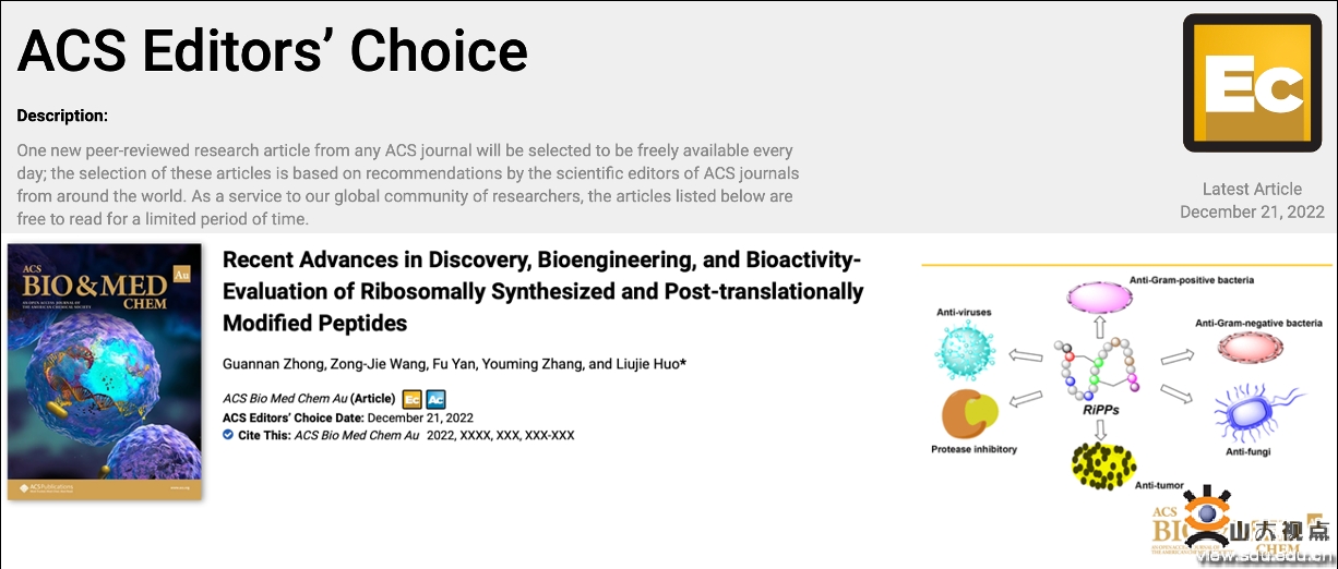 [本站讯]近日,微生物技术国家重点实验室(研究院)霍刘杰教授课题组对微生物核糖体肽类天然产物的结构与活性方面的研究成果进行了系统总结,对该领域的研究前景进行了展望。该工作以“Recent advances in discovery, bioengineering and bioactivity-evaluation of ribosomally synthesized and post-translationally modified peptides”为题发表在在ACS Bio & Med Chem Au(DOI: 10.1021/acsbiomedchemau.2c00062)。微生物技术国家重点实验室助理研究员钟冠男和博士后王宗杰为该论文的共同第一作者,霍刘杰教授为该论文的通讯作者,山东大学微生物技术国家重点实验室为唯一通讯单位。文章被美国化学会(ACS)推荐为“ACS Editors’ Choice”论文。