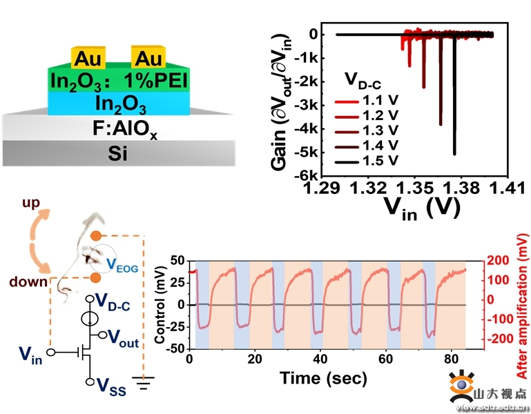 现阶段,大多数基于氧化物的源栅晶体管是通过真空气相生长技术制造的,严重限制了大面积制备的适用性,并且需要大量的资本投入。相比之下,溶液制备金属氧化物半导体和介电体薄膜,由于在室温下的大面积可加工性、低成本、机械柔性和大面积电学/形貌均匀性等优点,引起了广泛的研究兴趣。但是,鲜有利用溶液法制备的氧化物薄膜构筑源栅晶体管的研究。鉴于此,物理学院杨再兴教授课题组与美国西北大学、中国电子科技大学合作,采用溶液法制备了同质结氧化物薄膜并首次成功构筑了低功耗的源栅晶体管。其中同质结由溶液法制备的In2O3和In2O3:PEI聚合物组成。构筑的源栅晶体管具有低饱和电压(+0.8 ± 0.1 V)、低功耗(mW级别)和高固有增益(~2000)等优点。当使用频率-电容稳定性的高k氧化物F:AlOx作为介电层后,基于源栅晶体管所制备的反相器的增益更是高达5000。该源栅晶体管反相器成功实现了对眼电信号的有效监测:将~1 mV的眼电图信号放大到300 mV。相关研究结果以"High Performance and Low Power Source-Gated Transistors Enabled by a Solution-Processed Metal Oxide Homojunction”为题发表在PNAS(Proceedings of the National Academy of Sciences of the United States of America)(2023, 120, e2216672120)期刊上,山东大学特别资助类博士后庄昕明博士为论文共同第一作者。这一研究结果在可穿戴医疗传感和人机接口方面的应用潜力巨大。