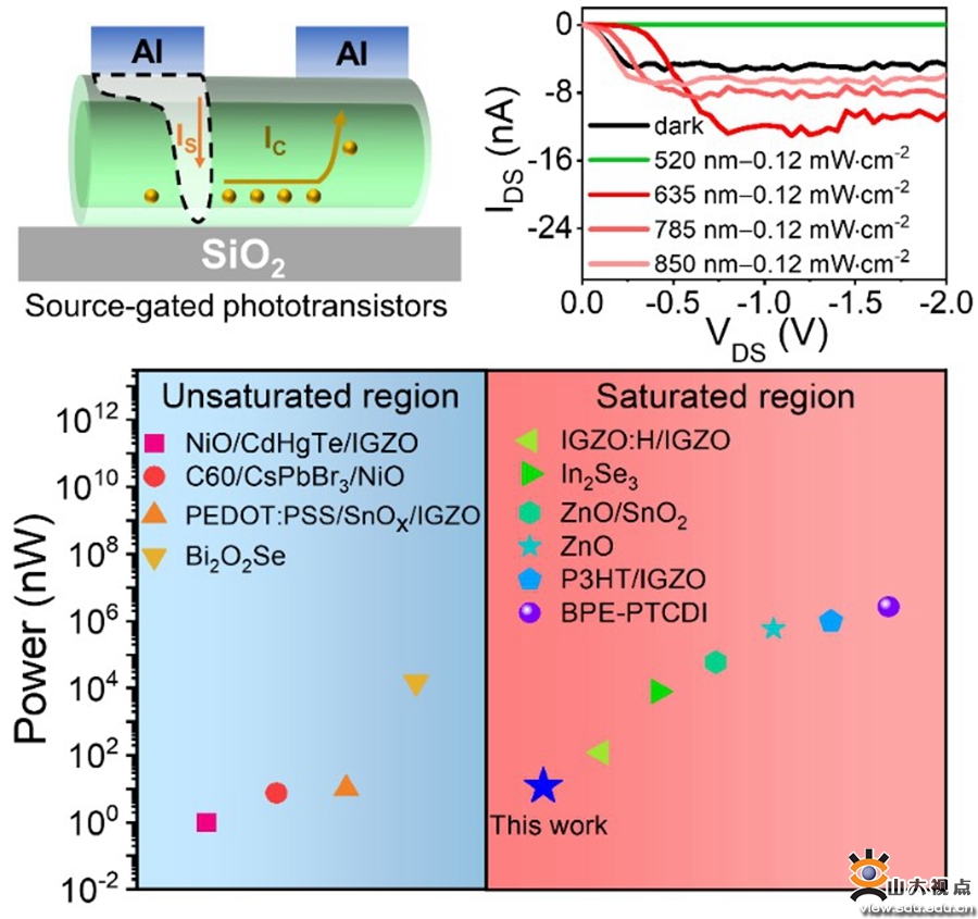 一维纳米材料具有优异的光吸收能力、优异的载流子分离与收集能力、优异的机械灵活性、丰富的表面态调控功能及良好的兼容性,具有应用于光电探测器中的独特的优势。然而,鲜有利用纳米线构筑源栅晶体管的研究,并且基于纳米线源栅晶体管的光电探测器的研究仍处于一片空白。近几年,转角电子学发展迅速,其中将具有二维晶体结构的半导体高质量生长为有一定旋转角度的一维纳米线也是热点。鉴于此,物理学院杨再兴课题组首次研究了基于该种纳米线的源栅晶体管及其光电探测行为。利用该源栅晶体管构筑的光电探测器,其功耗低至11.96 nW,远低于当前报道的工作在饱和区域的光电晶体管。器件的响应度和探测率也高达7.86×1012V×W-1和5.87×1013Jones。另外,本工作成功利用电压参数作为光电探测器件的探测信号:基于低维半导体构筑的光电探测器件,一般选择电流作为探测信号且探测电流大多是皮安或者纳安级别。本工作中利用源栅晶体管的低饱和电压特性,采用电压做为探测信号,达伏特级别(6.6×10-1V),更易于探测。由于富硫层的存在,该种纳米线源栅晶体管光电探测器表现出双向光探测行为。相关研究结果以“New Approach to Low-Power-Consumption, High-Performance Photodetectors Enabled by Nanowire Source-Gated Transistors”为题发表在Nano Letters(2022, 22, 9707–9713)期刊上,山东大学物理学院2021级博士生王明绪为论文第一作者。这一研究结果有望应用于光学逻辑运算、人工神经形态系统、可切换光成像和光通信等领域。