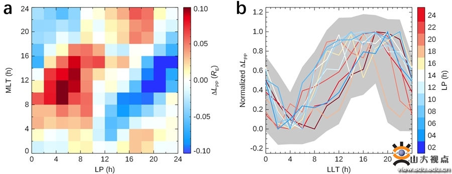 空间科学攀登团队最新研究成果通过分析国内外近40年来十余颗卫星(包括中国嫦娥三号、美国THEMIS以及欧洲Cluster等)穿越地球磁层“冷等离子体海洋”(即等离子体层)的数据,首次发现等离子体层顶(即等离子体层的外边界)的位置存在清晰的月潮变化。潮汐导致的等离子体层顶高度的变化可达800km,其特性显著区别于绝大部分低高度(如地壳、海洋和大气等)潮汐信号。如图2所示,(a)等离子层顶的扰动幅度(∆LPP,单位为地球半径RE,1RE=6371公里)随月相(LP)和磁地方时(MLT)的变化情况,(b)将不同月相下的归一化的扰动等离子层顶位置转换到月球地方时(LLT)的结果,可以清晰看到等离子体层月潮存在全日周期和全月周期,且高潮只有一个并出现在月球地方时的昏侧(LLT=18点)附近,其相位领先月球约90度,对应的低潮也只有一个且出现在月球地方时的晨侧(LLT=6点)附近。