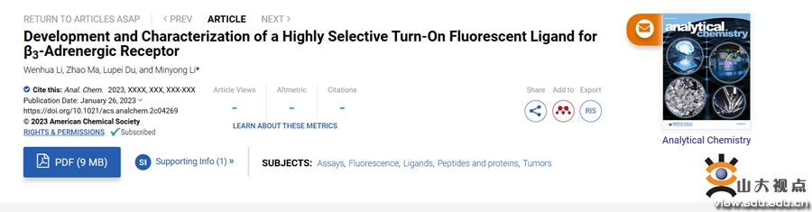 [本站讯]近日,药学院李敏勇教授团队在国际权威期刊Analytical Chemistry(中科院一区)上发表了题为“Development and Characterization of a Highly Selective Turn-on Fluorescent Ligand for β3-Adrenergic Receptor”的研究论文。药学院博士研究生李文华为第一作者,李敏勇教授为独立通讯作者,山东大学为第一作者单位和唯一通讯作者单位。