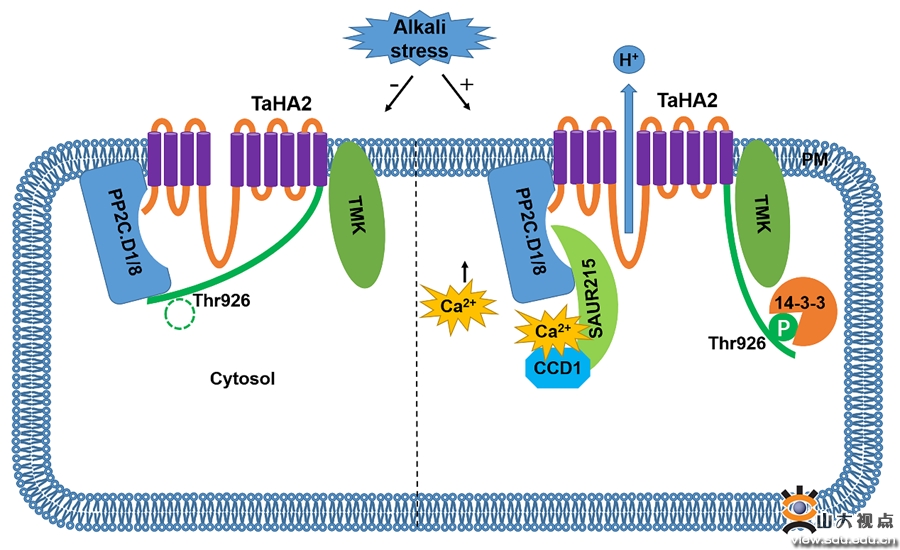 研究发现SR4的耐碱性与其根部较强的PM H+-ATPase活性及H+外排能力有关,且钙离子信号在SR4耐碱中发挥重要作用。作者鉴定到一个碱胁迫下在SR4根中特异上调表达的钙离子结合蛋白TaCCD1,其在小麦中过量表达能够促进PM H+-ATPase活性并增强小麦对于碱胁迫的耐受性,而其表达量敲低则降低PM H+-ATPase活性并导致小麦对于碱胁迫敏感,表明TaCCD1通过影响质膜H+-ATPase活性调控小麦耐碱性。作者进一步研究发现TaCCD1与生长素早期响应蛋白TaSAUR215相互作用并增强了TaSAUR215对两种D家族2C型蛋白磷酸酶TaPP2C.D1/8活性的抑制,而TaPP2C.D1/8通过对小麦根部表达量最高的PM H+-ATPase TaHA2的C端倒数第二位苏氨酸残基(Thr926)进行去磷酸化来抑制PM H+-ATPase的活性,从而调节小麦碱胁迫耐受性。