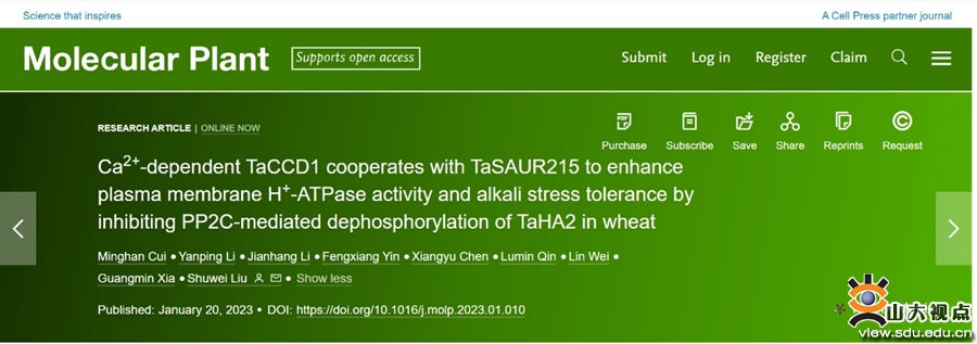 [本站讯]近日,生命科学学院刘树伟教授课题组在国际学术期刊Molecular Plant(IF,21.949)在线发表了题为“Ca2+-dependent TaCCD1 cooperates with TaSAUR215 to enhance plasma membrane H+-ATPase activity and alkali stress tolerance by inhibiting PP2C-mediated dephosphorylation of TaHA2in wheat”的研究论文,揭示了钙离子结合蛋白TaCCD1调控小麦耐碱性的分子机制,为小麦抗碱育种改良提供了理论依据和基因资源。