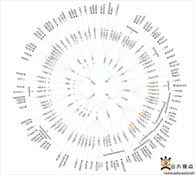 4种胃肠道疾病和6种精神障碍多效性关联全景图。该环形树状图包括4种胃肠道疾病(内圈)和6种精神障碍(第二圈),共有24对性状对。在19对性状对中共识别出83个多效性位点(第三圈),其中53个位点中最显著的遗传变异位点对于相应性状对具有相同的效应方向(由+表示),而剩余30个具有相反的效应反向(由-表示);24个多效性位点在相应性状对中共定位(橙色圆点)并且11个位点在相应胃肠道疾病、精神障碍、肠道微生物中共定位(灰色圆点,共定位的微生物线上标注)。MAGMA方法共识别出196个多效性基因(去重后158个)。在该图中,对于具有3个以上多效性基因的性状对,只展示其前3个多效性基因,并且其显著性按顺时针递减(第四圈),E-MAGMA方法识别的至少在一种胃肠道组织或脑组织以及其他组织中具有组织特异性的基因也进行了标注(深蓝色圆点)。