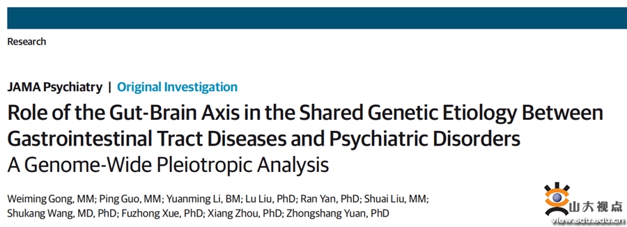 [本站讯]近日,JAMA Psychiatry杂志(IF=25.94,中科院1区TOP)在线发表了题为“Role of the Gut-Brain-Axis in the Shared Genetic Etiology Between Gastrointestinal Tract Diseases and Psychiatric Disorders: A Genome-wide Pleiotropic Analysis ”的胃肠道疾病与精神障碍的多效性分析结果,公共卫生学院硕士研究生巩伟明、博士研究生郭萍为该论文的共同第一作者,学院袁中尚教授为论文通讯作者,山东大学为第一和通讯作者单位。