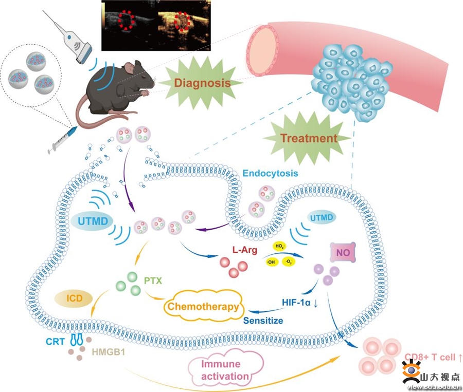 [本站讯]近日,山东大学齐鲁医院超声科李杰教授团队在Journal of Nanobiotechnology(中科院1区,5年平均IF=11.509)发表题为“Ultrasound targeted microbubble destruction-triggered nitric oxide release via nanoscale ultrasound contrast agent for sensitizing chemoimmunotherapy”的研究论文,报道了超声靶向微泡破坏技术联合纳米级超声造影剂在有效控释一氧化氮(NO)及其增敏肿瘤化疗—免疫联合治疗的应用。该研究构建了一种利用超声靶向微泡破坏技术控释一氧化氮的纳米体系,同时负载化疗药物和一氧化氮供体,并将其定点递送至肿瘤部位,同时借助一氧化氮带来的化疗和免疫双重增强效应,实现了对肿瘤的高效联合治疗,为肿瘤化疗-免疫联合治疗提供了新的纳米平台和治疗策略。山东大学齐鲁医院为该论文的第一作者和通讯作者单位,李杰教授为该论文的通讯作者,博士研究生赵雅丁为该论文的第一作者。