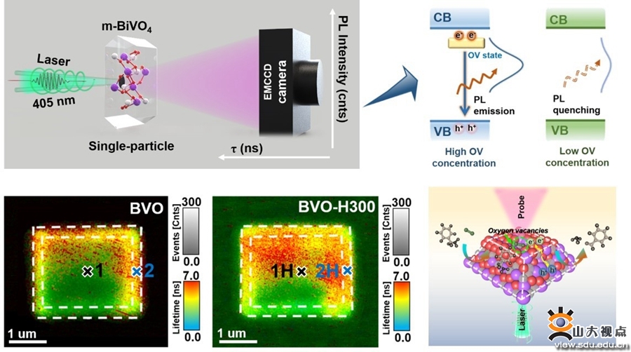 [本站讯]近日,晶体材料国家重点实验室黄柏标、郑昭科教授团队在微纳尺度单晶缺陷成像方面取得新进展,通过自主研制的“时间—空间”分辨单颗粒光谱系统,成功实现了半导体单晶表面缺陷的纳米级成像。研究成果以“In Situ Monitoring of the Spatial Distribution of Oxygen Vacancies and Enhanced Photocatalytic Performance at the Single-Particle Level”为题发表在国际学术期刊Nano Letters上,山东大学是唯一作者单位。该工作在黄柏标教授的指导下完成,第一作者是山东大学晶体材料国家重点实验室2020级博士生张雨佳,通讯作者为郑昭科教授。
