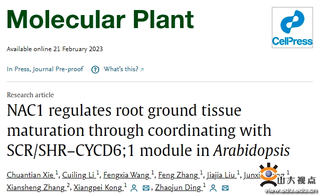 [本站讯]近日,生命科学学院丁兆军教授团队在Molecular Plant杂志(IF: 21.949)上以Article形式在线发表了题为NAC1 regulates root ground tissue maturation through coordinating with SCR/SHR–CYCD6;1 module in Arabidopsis的研究论文。该研究揭示了拟南芥NAC转录因子家族成员NAC1协同SHR/SCR-CYCD6;1模块调控植物根基本组织成熟(root ground tissue maturation)的分子机制。