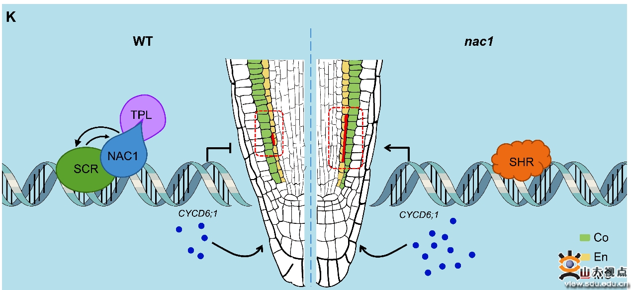 为了进一步解析NAC1如何参与SHR/SCR信号途径,该研究通过酵母双杂交,BiFC和CoIP等实验手段验证了NAC1与SHR/SCR蛋白的互作。后续的实验证明,NAC1-TPL和SCR形成复合体以协同的方式抑制CYCD6;1表达,而NAC1与SHR蛋白通过拮抗的方式抑制各自结合下游CYCD6;1的能力及转录表达,从而维持根尖正常的发育进程和MC分裂水平。在NAC1功能缺失后,一方面SCR抑制CYCD6;1转录表达的能力下降,另一方面NAC1拮抗SHR结合CYCD6;1启动子的能力也降低,最终体现出SHR转录诱导CYCD6;1的上调表达和根尖MC分裂水平的显著升高。