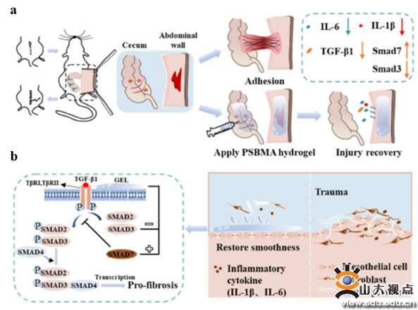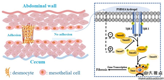能在不规则表面形成物理屏障又能生物降解的水凝胶,可有效预防腹腔手术后粘连。翟光喜/叶磊团队结合右旋糖酐和两性离子聚合物优异的抗蛋白粘附性能,通过ATRP方法制备了两性离子接枝聚合物(Dex-g-SBMA),该聚合物可自组装形成可生物降解的水凝胶,可在病灶部位覆盖伤口。体外细胞实验表明该水凝胶具有良好的生物可降解性和生物相容性,可对TGF-β/Smad信号通路产生影响,可抑制Smad3并激活Smad7通路,从而降低组织纤维化概率,减少纤维蛋白沉积,抵抗成纤维细胞的粘附。在体内大鼠腹壁-盲肠损伤粘连模型中,水凝胶表现出良好的抗粘连能力,能够有效地抑制术后腹壁-盲肠的粘连。该研究发表于Materials & Design(中科院一区,TOP期刊),论文第一作者是药学院硕士研究生黄苏苏和方跃霖,叶磊副研究员、翟光喜教授和济南大学张亚彬副教授为共同通讯作者,山东大学药学院为第一作者和通讯作者单位。