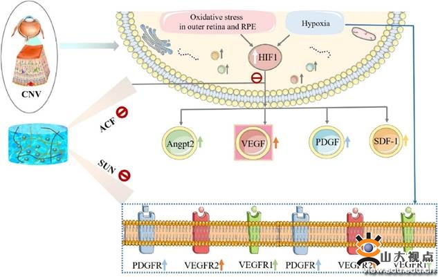 脉络膜新生血管(CNV)作为一种常见的多因素眼底病变,已成为老年人严重视力丧失的主要原因。主要治疗方法是玻璃体内侵入性注射抗VEGF药物,但频繁眼内注射抗VEGF药物对CNV患者有严重的视力影响。除VEGF是CNV形成的一种危险因素外,缺氧在CNV的进展中起着核心作用。缺氧诱导因子-1 (HIF-1)对VEGF有明显的诱导作用,是新生血管性眼病的主要分子途径。因此,将抗VEGF药物与靶向HIF-1药物联合使用是一种有价值的协同策略,可改善CNV患者的视力效果。翟光喜/叶磊团队利用低附着性透明质酸(HA)和两性离子材料,采用电击化学法制备了包载疏水药物(SUN)和亲水性药物(ACF)脂质体(Lip)的多功能原位注射水凝胶(HAC)。实验证明该水凝胶制剂可显著延长药物的治疗作用,显示了良好的抗血管生成作用,能有效改善CNV病变,是一种微创治疗新生血管性眼病的新方法。该研究发表于Materials Today Nano(中科院一区,TOP期刊),论文第一作者是药学院博士后李靳,翟光喜教授和叶磊副研究员为共同通讯作者,山东大学药学院为第一作者和通讯作者单位。