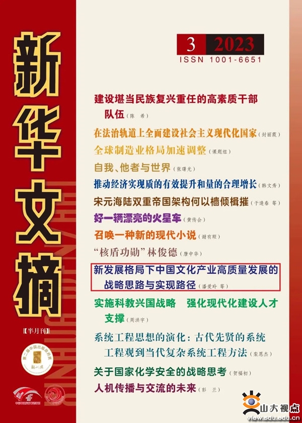 [本站讯]近日,管理学院潘爱玲教授团队的文章“新发展格局下中国文化产业高质量发展的战略思路与实现路径”被2023年第3期《新华文摘》全文转载并作封面文章推荐。该文章的作者还包括2020级博士研究生王雪与中国海洋大学管理学院讲师刘昕。原文发表于《山东大学学报(哲学社会科学版)》2022年第6期的党的二十大重大理论与现实问题研究专栏。该文章是潘爱玲教授主持的国家社科基金重大项目“现代文化产业体系和市场体系的协同发展研究”的阶段性研究成果。