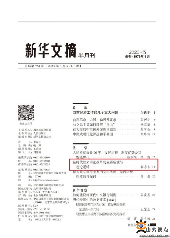 [本站讯]近日,法学院崔永东教授发表于《政治与法律》2022年第12期的文章“新时代以来司法改革的主要成就与理论逻辑”被《新华文摘》2023年第5期全文转载。