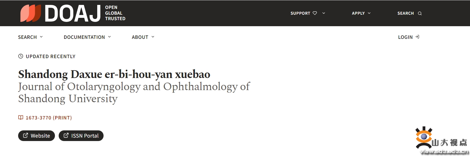 [本站讯]3月16日,《山东大学耳鼻喉眼学报》正式被DOAJ(Directory of Open Access Journals,开放存取期刊目录)数据库收录(查询地址:https://doaj.org/),这是该数据库目前收录的国内耳鼻咽喉科学类和眼科学类期刊中唯一收录的中文学术期刊,标志着《山东大学耳鼻喉眼学报》在开放获取政策、著作权与许可政策、同行评审政策等方面得到了国际学术界的认可,对吸引国内高质量原创性科研成果、进一步提升期刊的学术影响力具有重要意义。
