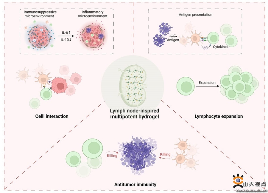 图2.淋巴结功能启发免疫调节水凝胶抗肿瘤免疫机制示意图。水凝胶原位植入术后瘤腔从而克服血脑屏障的药物阻隔作用,并逆转腺苷介导免疫抑制性微环境,促进了炎性微环境的形成,增强免疫细胞相互作用,并通过抗原呈递促进淋巴细胞增殖,激活抗肿瘤免疫。