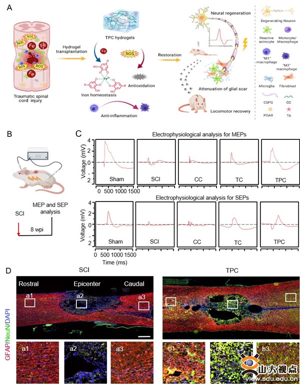 图1.(A)多酚基水凝胶重塑脊髓损伤铁稳态促进运动功能恢复的示意图;水凝胶促进脊髓损伤后运动诱发电位(MEP)与体感诱发电位(SEP)的恢复(B,C)以及成熟神经元在损伤部位的迁移(D)。
