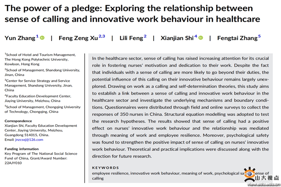 [本站讯]近日,山东大学管理学院、山东大学服务战略与服务管理研究中心主任徐凤增教授与香港理工大学酒店及旅游业管理学院研究助理教授张云(第一作者,山东大学管理学院2022届博士毕业生)、山东大学管理学院博士研究生冯立莉、嘉应学院教授史先建(通讯作者)、重庆理工大学教授张凤太合作的关于医疗保健领域护士创新行为的最新研究成果“The power of a pledge: Exploring the relationship between sense of calling and innovative work behaviour in healthcare”发表于Creativity and Innovation Management(SSCI, Q3),该研究是服务创新与智慧旅游学术沙龙合作的成果,也是团队研究由酒店行业的员工创新向医疗健康领域的员工创新的延伸。