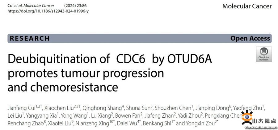 [本站讯]4月29日,山东大学齐鲁医院泌尿外科教授史本康、山东大学基础医学院教授邹永新联合山东大学微生物技术国家重点实验室、中国医学科学院肿瘤医院团队合作在Molecular Cancer杂志(中科院1区Top,五年IF=33.1)在线发表题为“Deubiquitination of CDC6 by OTUD6A promotes tumour progression and chemoresistance”的研究论文。山东大学齐鲁医院博士后崔剑锋、柳晓晨为论文共同第一作者,史本康教授、邹永新教授、武大雷教授、邢念增教授为该论文的共同通讯作者,山东大学齐鲁医院为该论文第一作者单位,山东大学齐鲁医院、山东大学基础医学院、山东大学微生物技术国家重点实验室、中国医学科学院肿瘤医院为共同通讯单位。