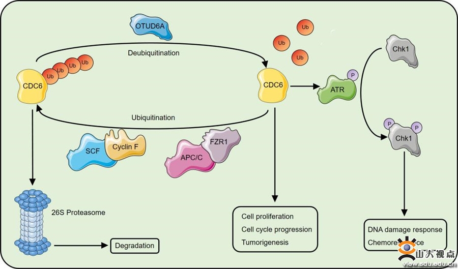细胞分裂周期蛋白6(CDC6)是DNA复制起始阶段的关键调控因子,其表达水平的精准调控是细胞正常增殖和个体发育的重要保障。CDC6突变可导致Meier-Gorlin综合征,此外CDC6在包括膀胱癌、肾癌以及肺癌等多种恶性肿瘤中表达异常上调,且与预后不良相关。转录后水平调控尤其是泛素化依赖的蛋白降解是对CDC6表达调控的主要机制。CDC6可被数个E3泛素连接酶复合体泛素化。然而,CDC6蛋白水平的去泛素化机制尚未明确。