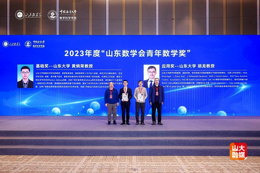 山东数学会将青年数学奖基础数学奖授予黄炳荣教授,将青年数学奖应用数学奖授予胡龙教授,以表彰他们在学术领域作出的突出贡献。颁奖词中指出,黄炳荣教授解决了有80多年历史的Rankin-Selberg问题,改进了菲尔兹奖得主Selberg等的经典结果,进而得到了几类高阶L-函数的亚凸界结果;围绕随机波猜想和量子波动猜想,解决了自守形式的三阶矩问题和几类量子方差问题;证明了高维本原有理点的联合实效均匀分布定理。胡龙教授在双曲系统的镇定性、能控性和同步性等方面取得了多个突破性的原创结果,包括解决了自20世纪80年代以来长期悬而未决的拟线性非齐次双曲系统的边界镇定问题;找到了线性非齐次双曲系统精确能控的临界控制时间;建立了拟线性耦合波动方程组的边界同步性,填补了非线性双曲同步研究的空白。