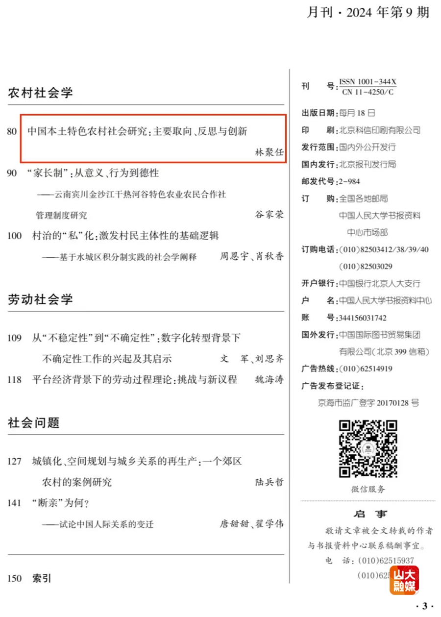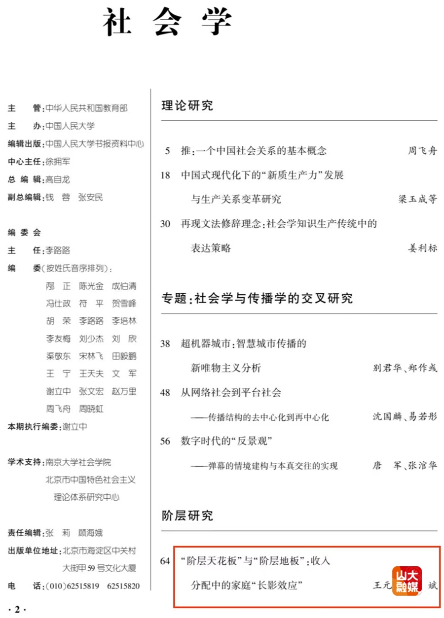 [本站讯]近日,人大复印资料《社会学》2024年第9期全文转载了哲学与社会发展学院教授林聚任的题为《中国本土特色农村社会研究:主要取向、反思与创新》的论文、山东大学哲社学院助理研究员王元超与中国人民大学副教授朱斌共同发表的题为《“阶层天花板”与“阶层地板”:收入分配中的家庭“长影效应”》的论文,前者原载于《西北师大学报(社会科学版)》2024年第4期,后者原载于《社会学评论》2024年第3期。
