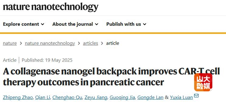 [本站讯]近日,药学院栾玉霞教授团队在期刊Nature Nanotechnology在线发表题为“A collagenase nanogel backpack improves CAR-T cell therapy outcomes in pancreatic cancer”的研究论文。山东大学为唯一单位,博士研究生赵志鹏、李倩为本文共同第一作者,栾玉霞教授为唯一通讯作者。
